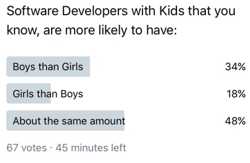 Another interesting note is that when looking at my groups of friends who are Software Engineers and have kids, the break down is: