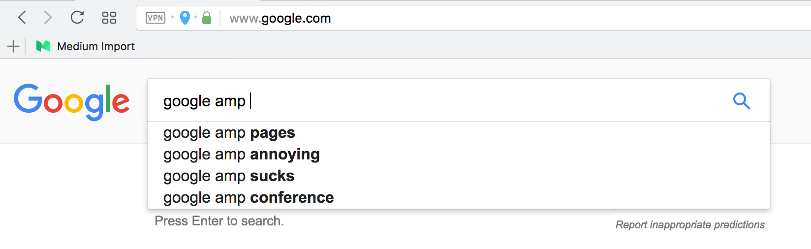 I know that I am not alone in this desire, because when I search for “google amp” on Google I get this:
