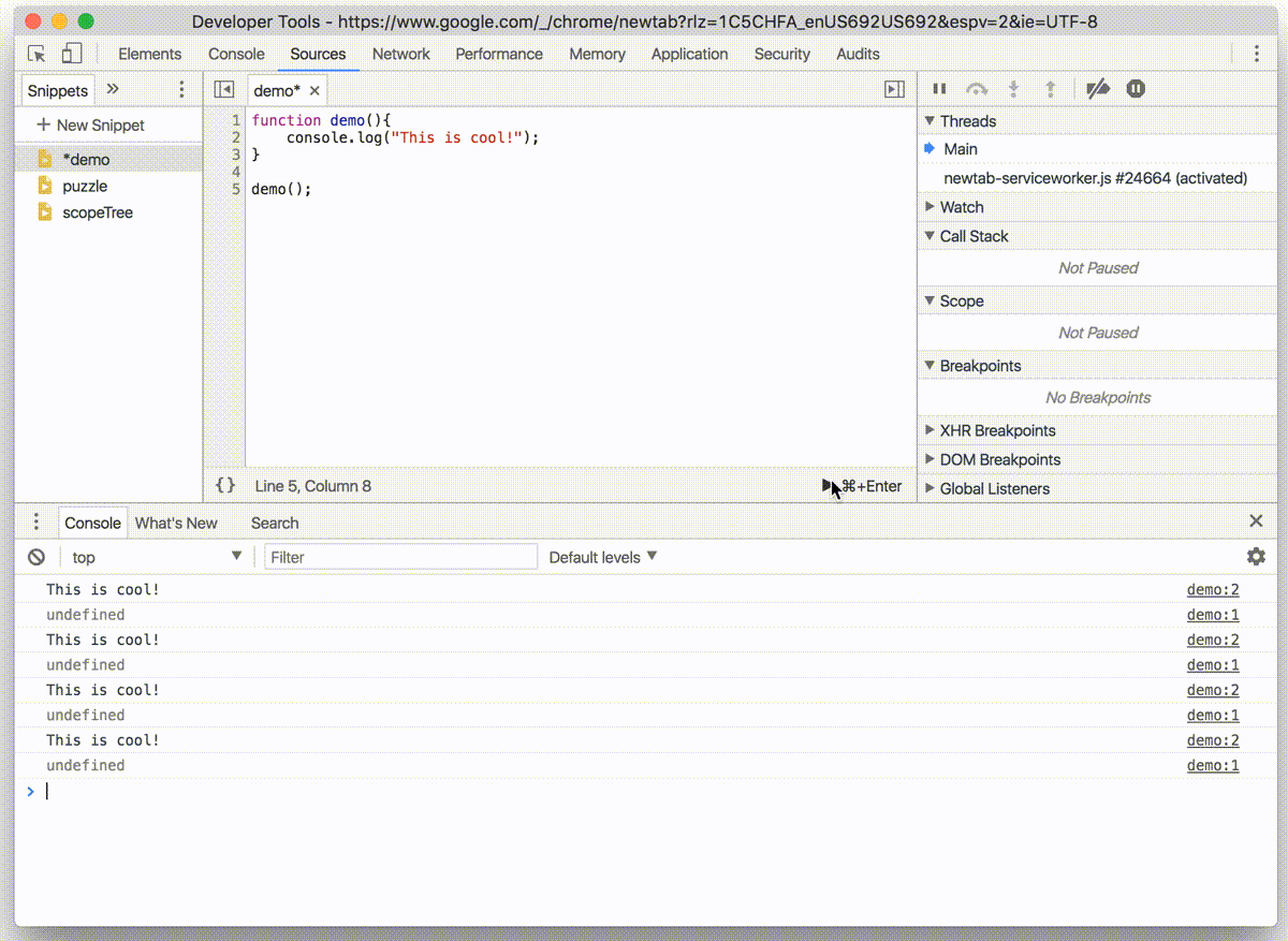 Once the new snippet is created, it can be edited and debugged like any other JavaScript file.